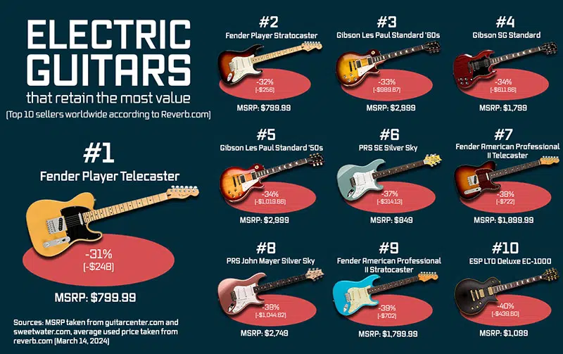 We analyzed the used prices of the 40 best-selling electric guitars and compared them to new prices. Here we show you which electric guitars are losing the most and the least value on the used guitar market.